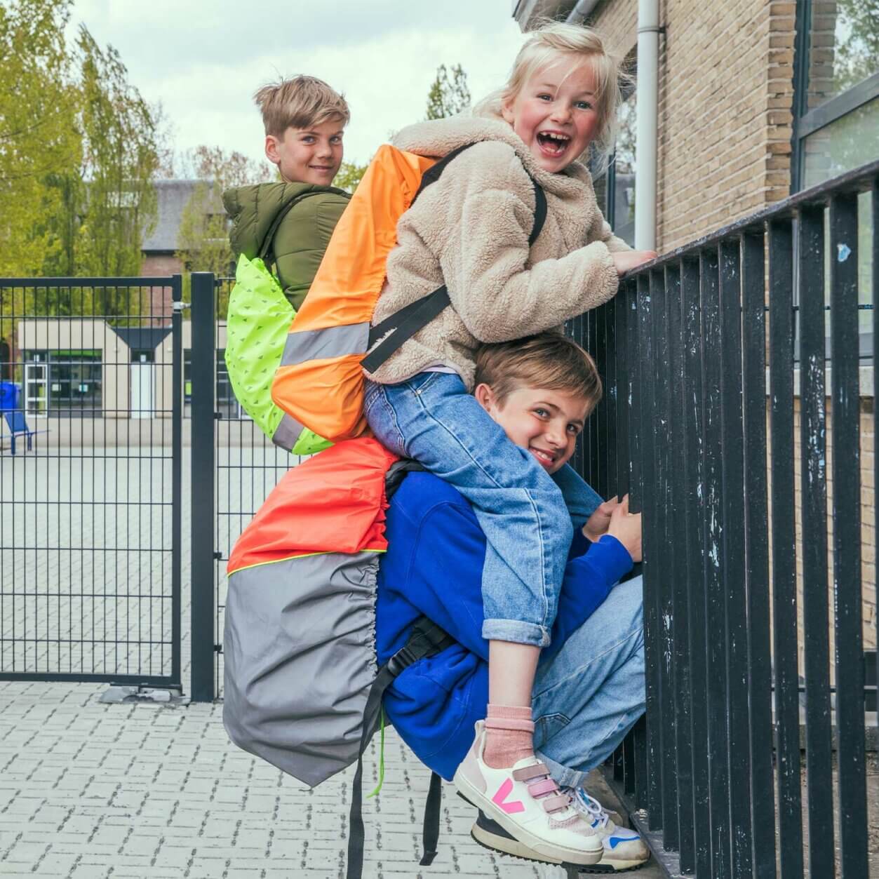 When your child cycles to school with a backpack on the back the high-vis vest is partially hidden. Therefore we suggest wearing a reflective backpack cover, clip-on or keychain with light in addition to a safety vest so passersby can notice them from behind as well.