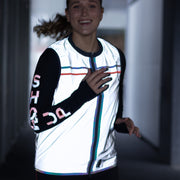 the vibrant fluorescent red details bring a pop of color during the day, while the reflective and iridescent fabrics makes you fully visible at night.