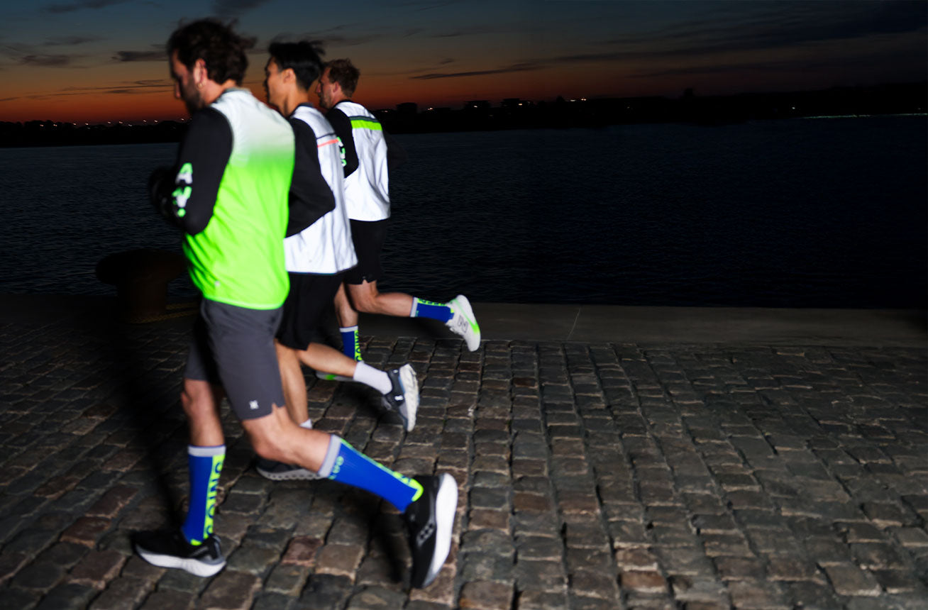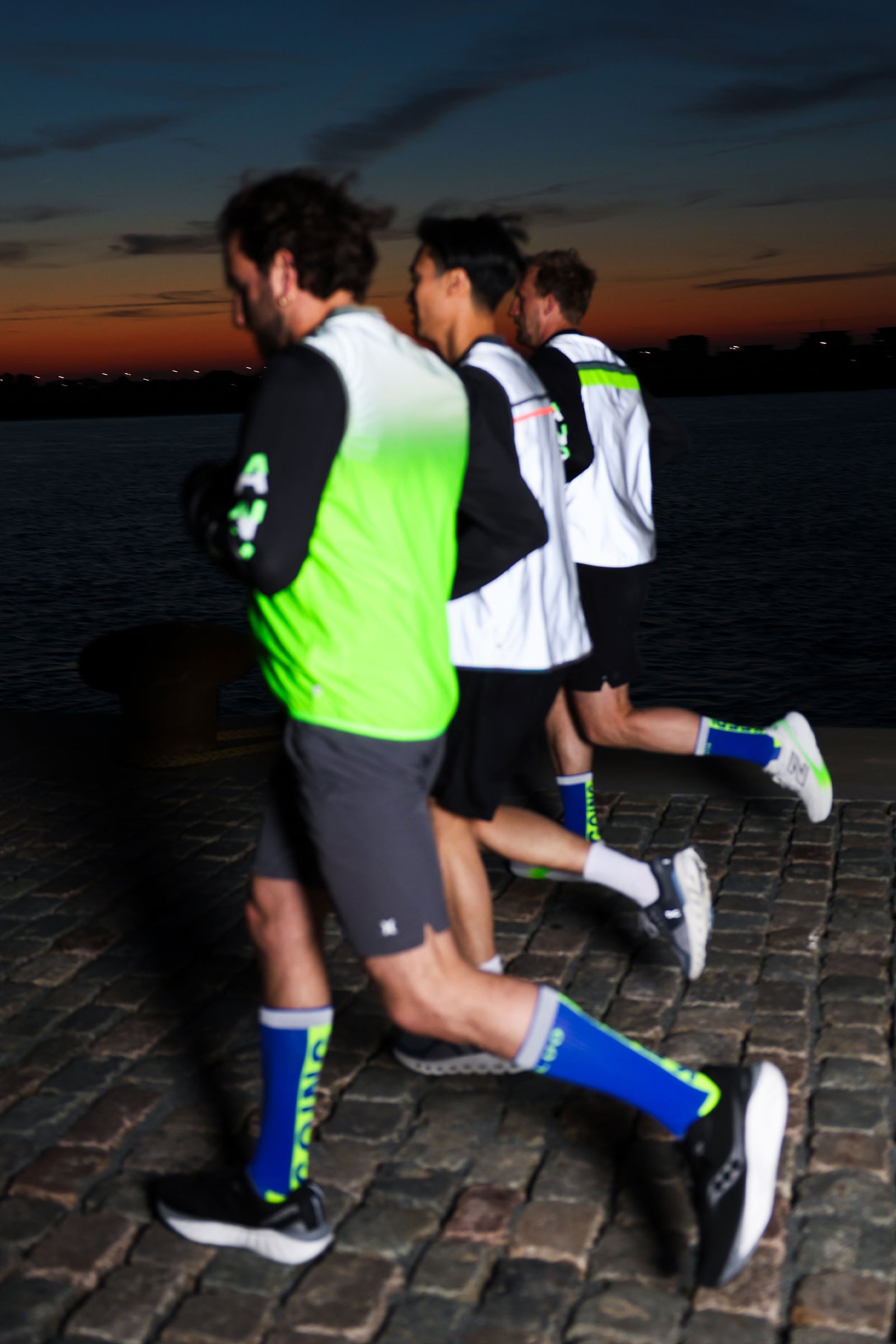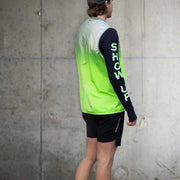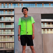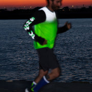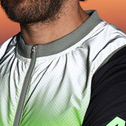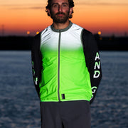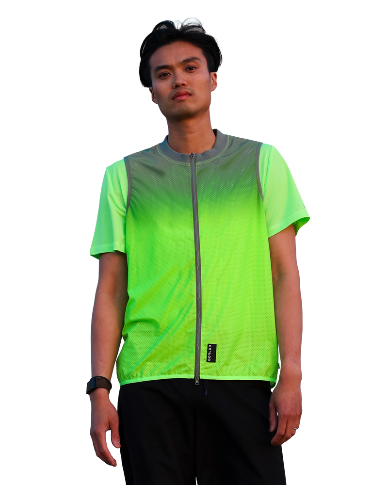 crafted from fully reflective fabric topped with a green ombré fade print, this bodyglower ensures visibility both day and night. in low-light conditions, it shimmers with a mix of green, khaki, and sparkling grey, making you visible from up to 150 metres in the dark. By day, the stunning neon green ombré design, inspired by northern light hues, keeps you brightly visible.