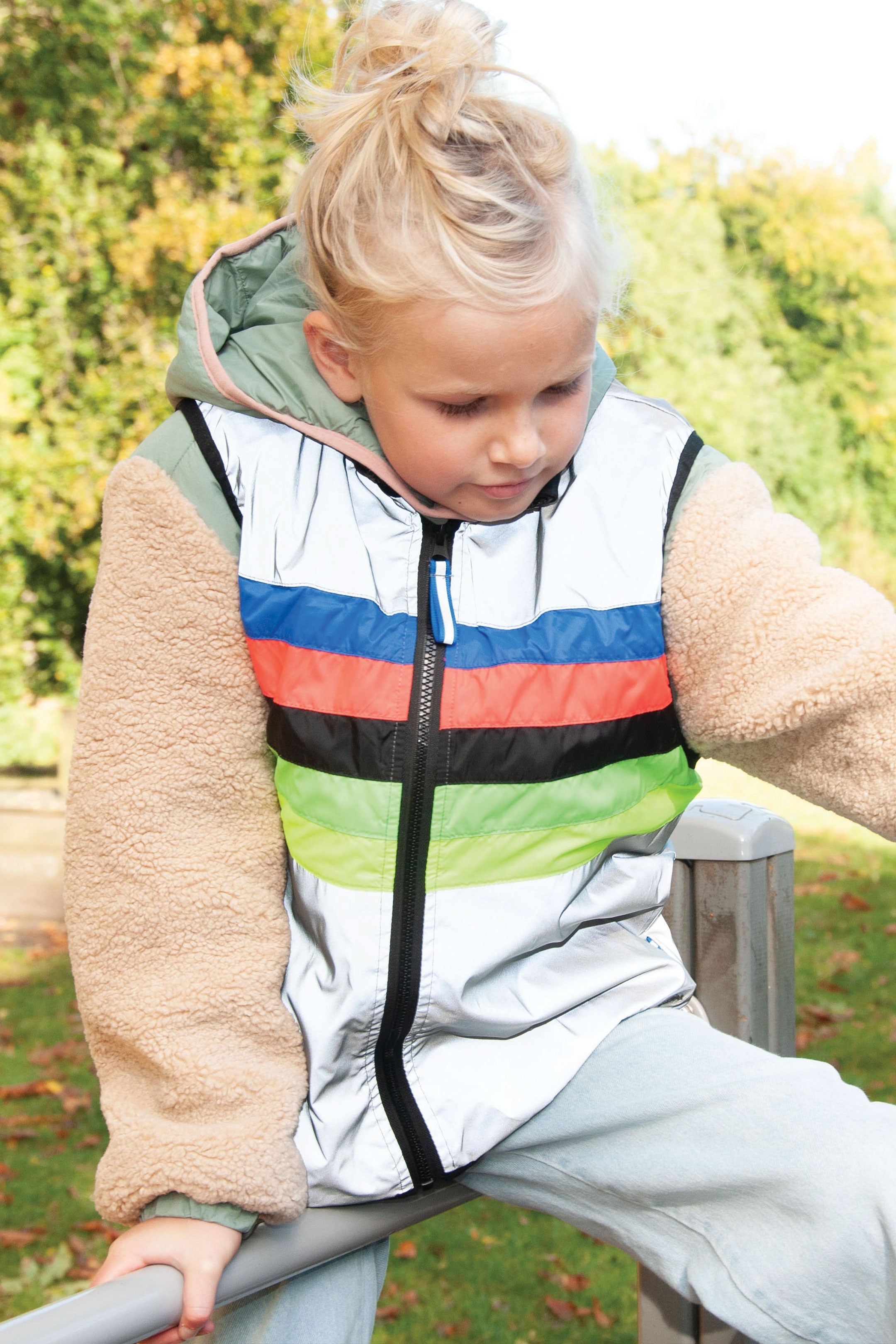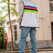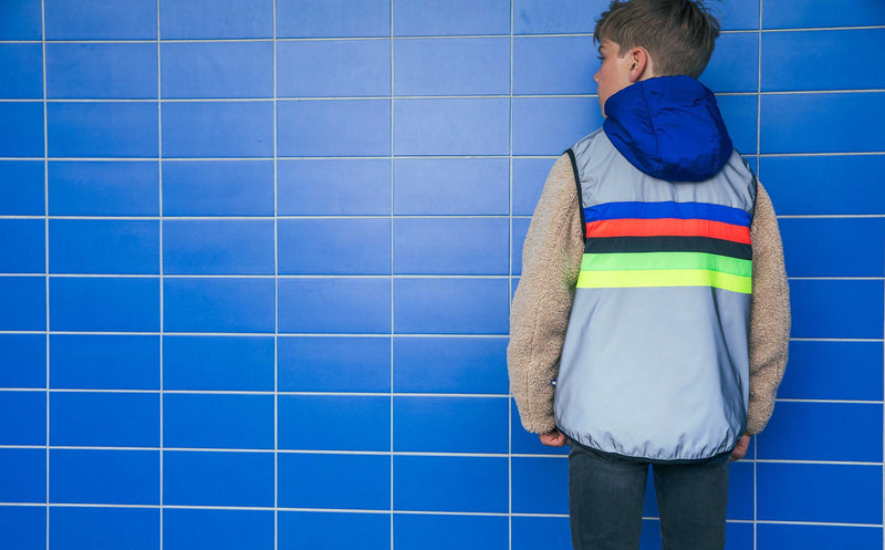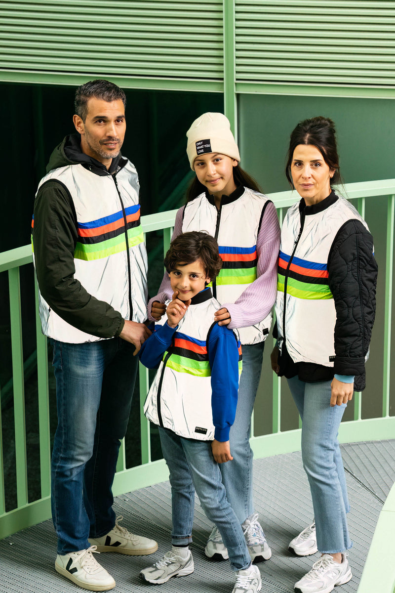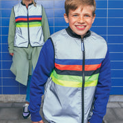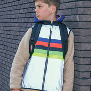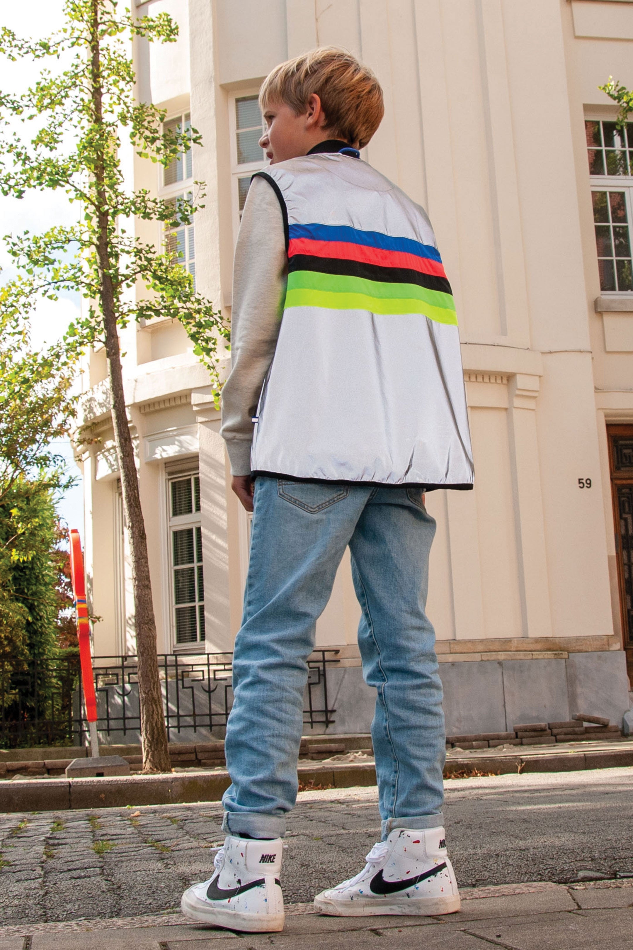 inspired by the iconic rainbow jersey of world champion cyclists, this statement piece ensures your kids stand out. bright colors keep you visible during the day, while the reflective fabric enhances your visibility at night.