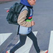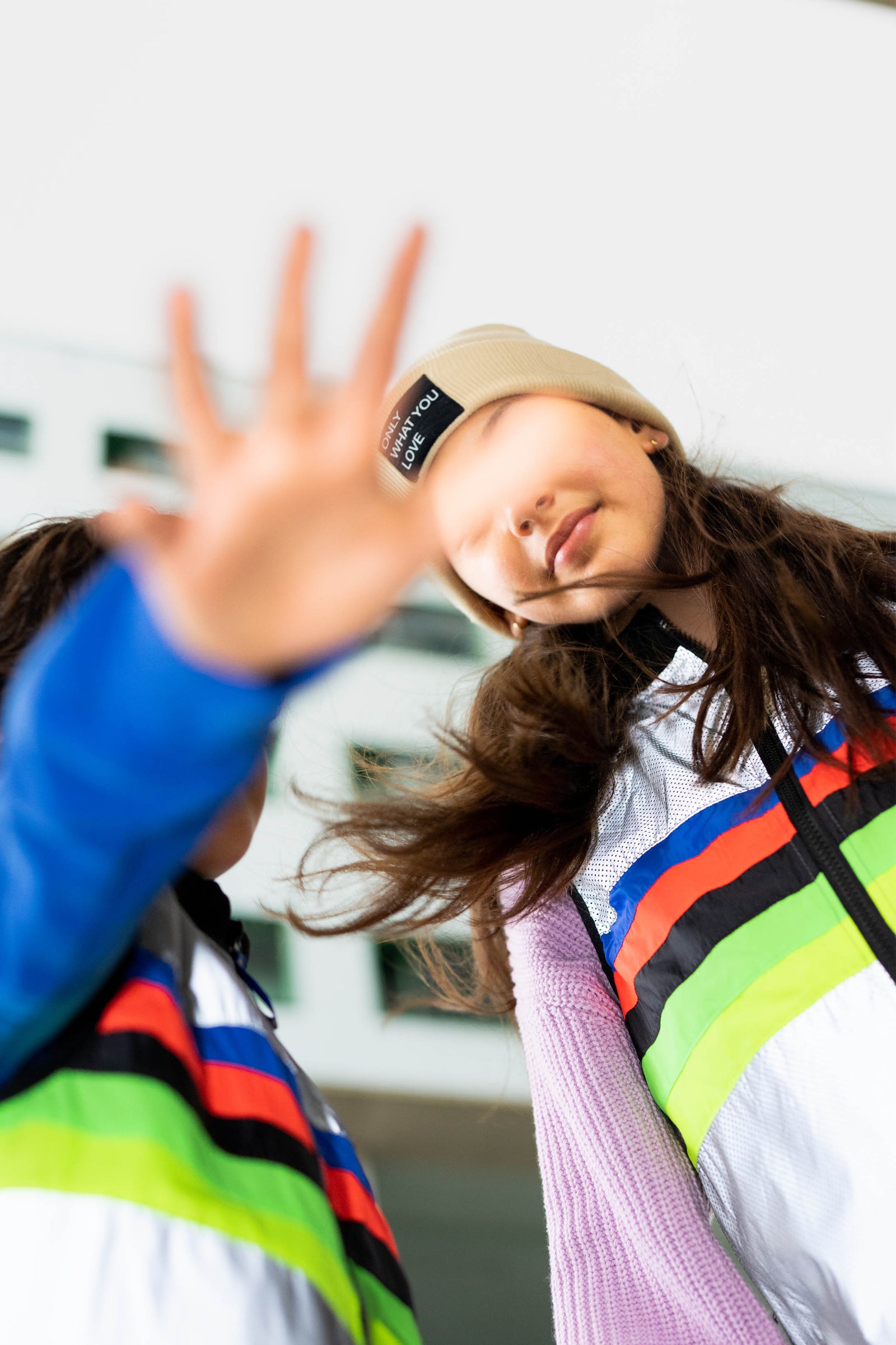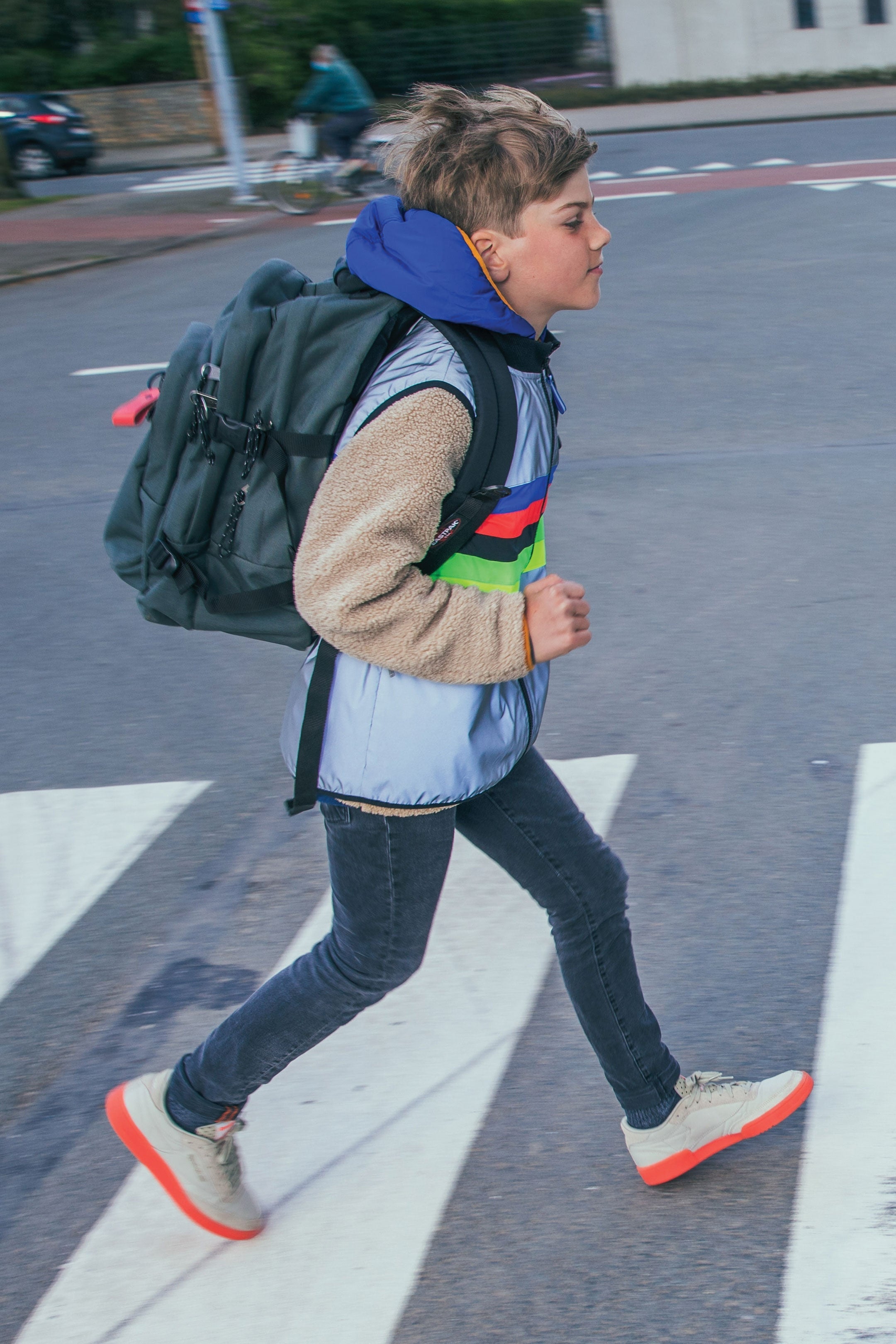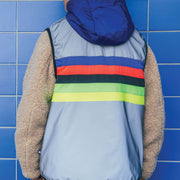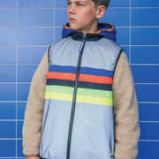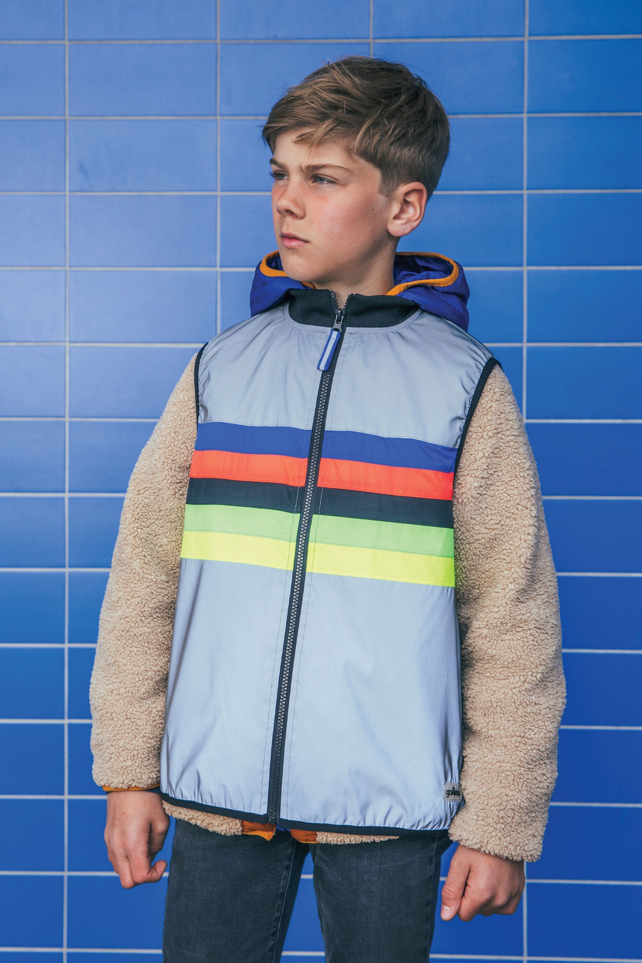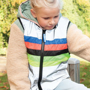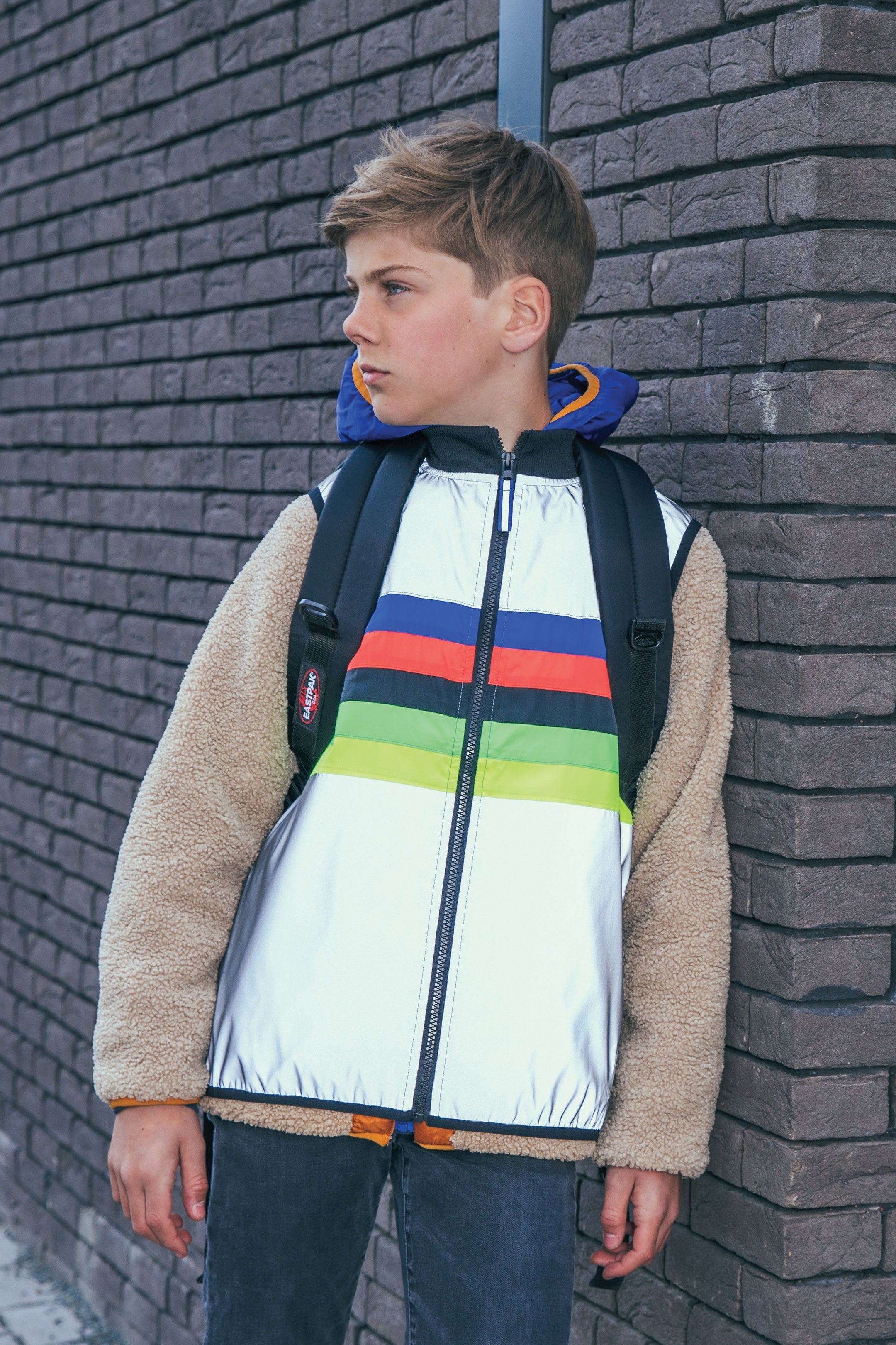 inspired by the iconic rainbow jersey of world champion cyclists, this statement piece ensures your kids stand out. bright colors keep you visible during the day, while the reflective fabric enhances your visibility at night.