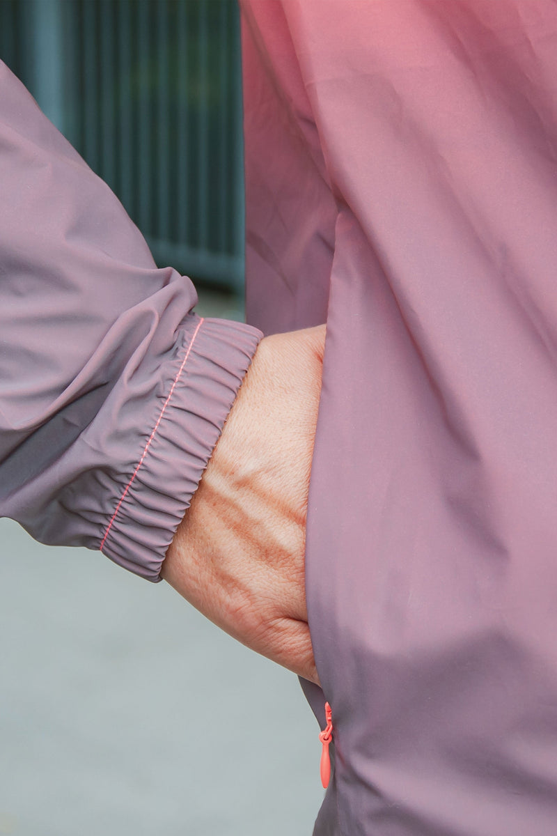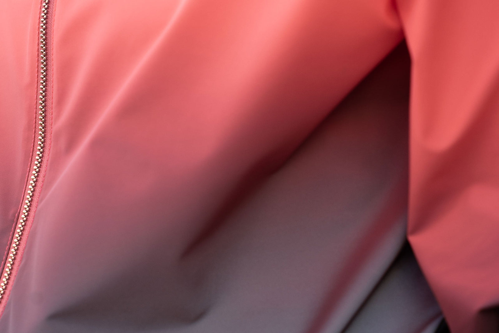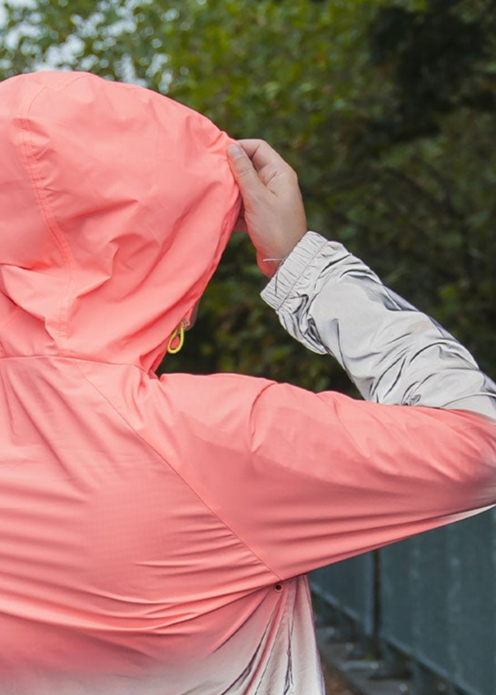 inspired by the sunset, this jacket features a stunning ombre effect, transitioning from neon coral to reflective grey. in daylight, the core shines pink-purple, while at nightfall, the mid-tones mix into taupe, mauve, and shimmering grey. finished with a matching rose gold zipper and an elegant pull tab, this jacket reflects from top to bottom in the dark.