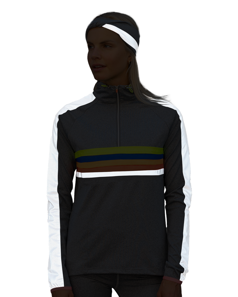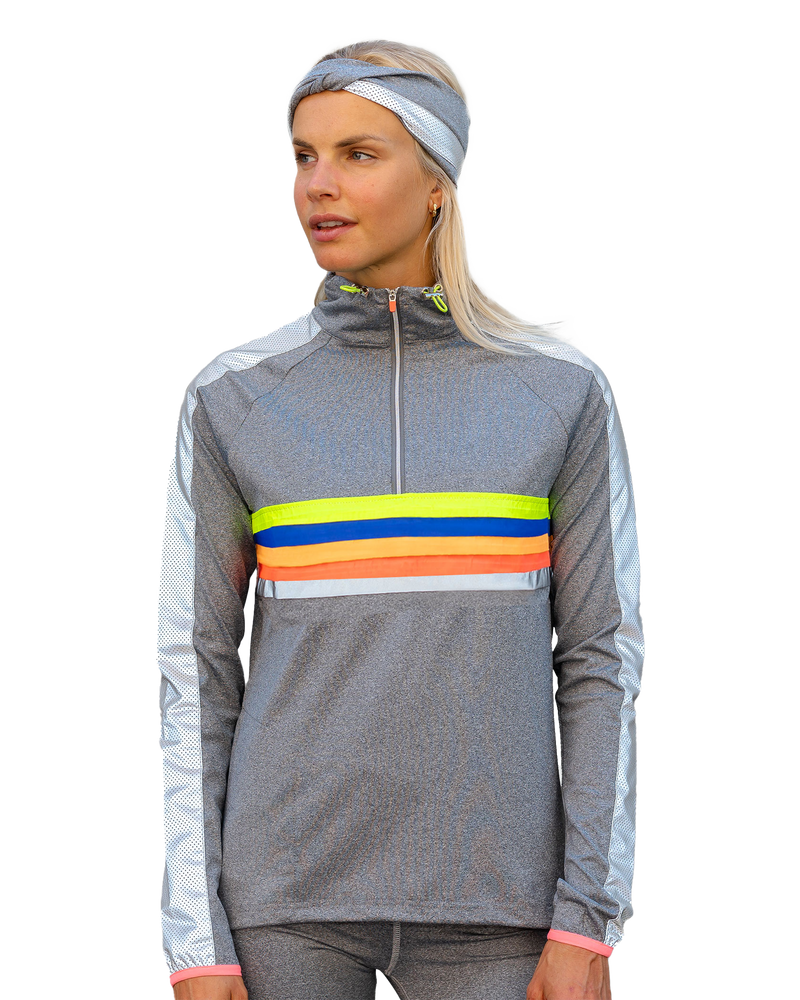 run with confidence through the darkness in this sweater! the bright neon rainbow colors ensure you stand out at dawn, while reflective panels on the sleeves keep you visible at night. for even greater visibility in low light, pair it with a fully reflective bodyglower.