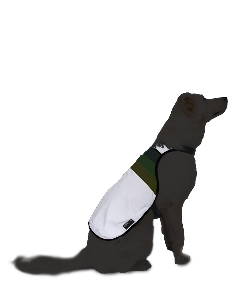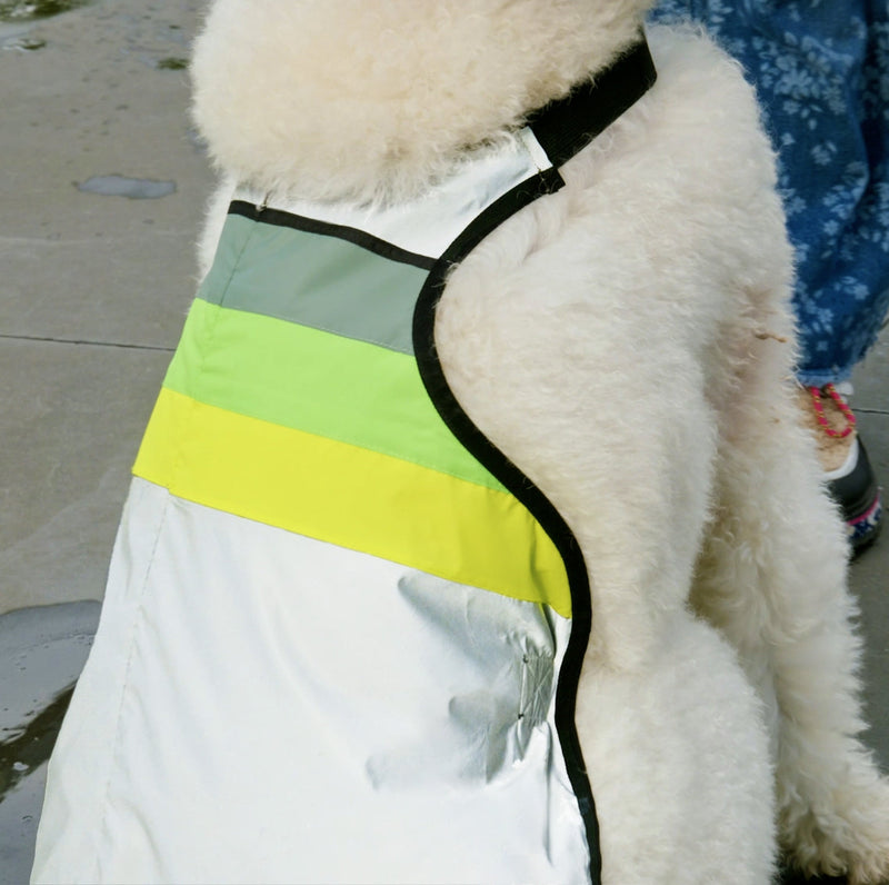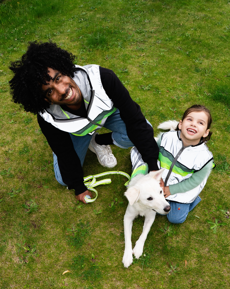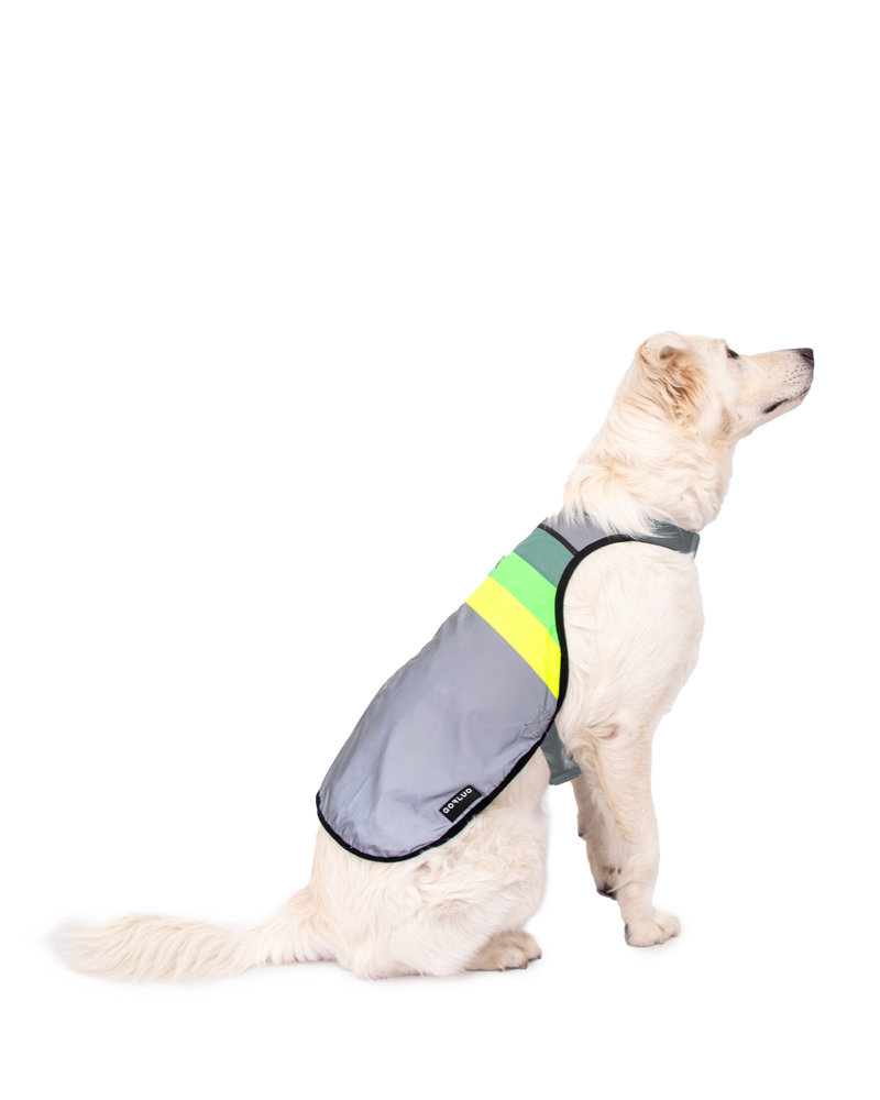 ensure your dog is highly visible day and night with this adorable doggyglower. the reflective fabric enhances nighttime visibility, while the neon stripes, inspired by the green glow of the northern lights, ensure they steal the show during the day.