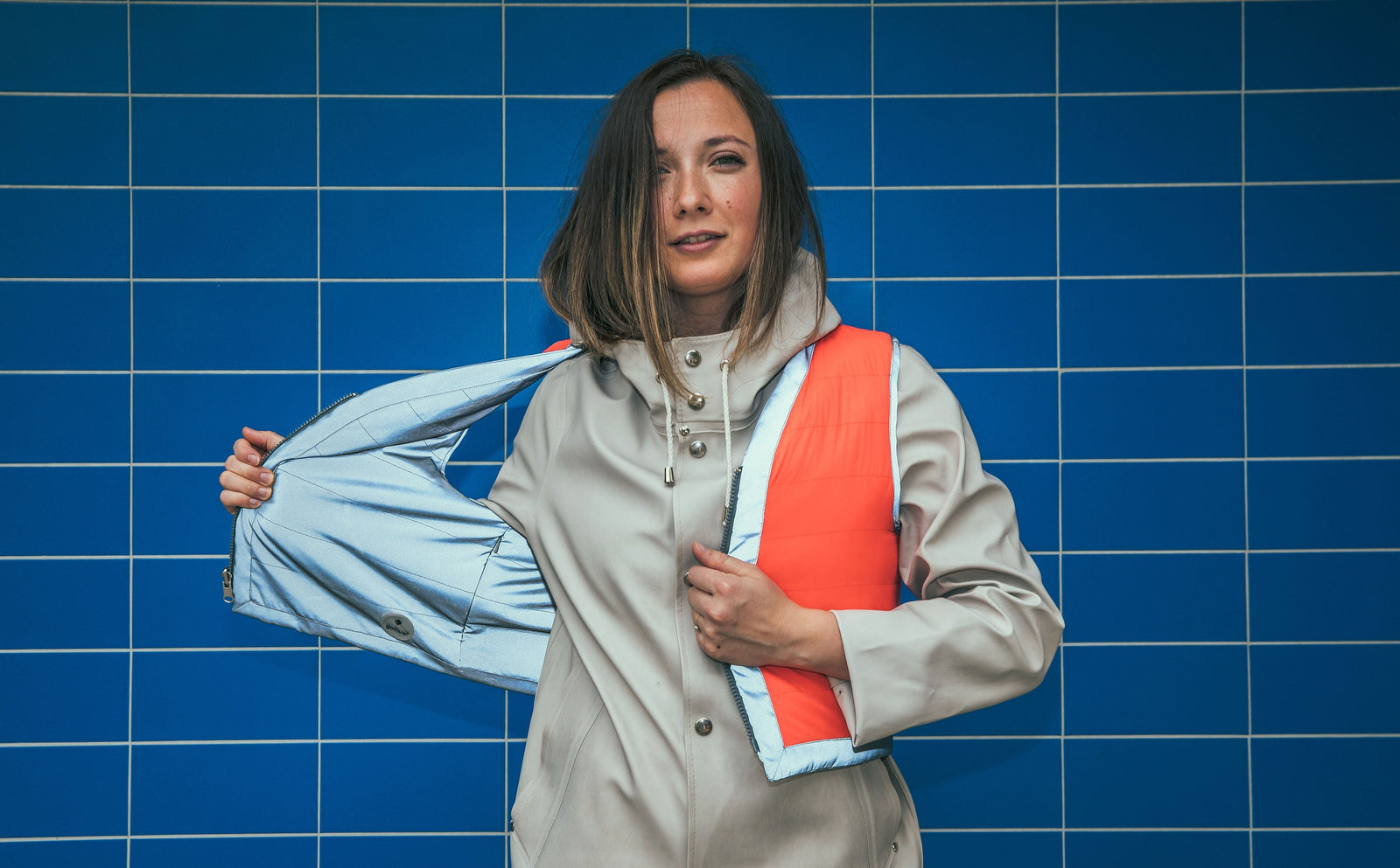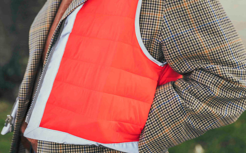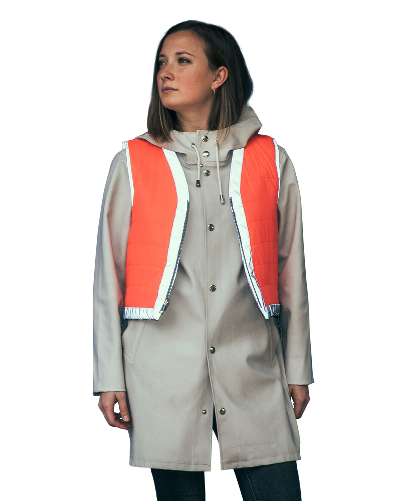 with pockets on both sides and an elegant zipper, this cropped safety vest pairs beautifully with a long coat.