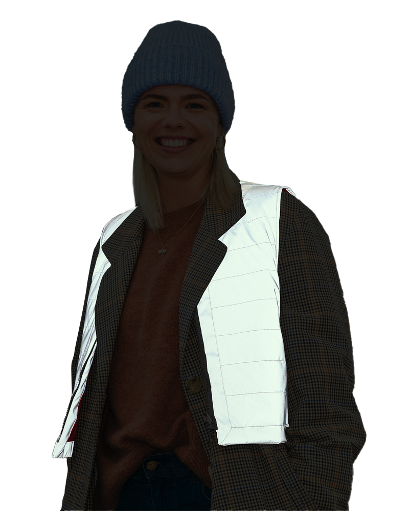 stand out in neon red during the day, flip to the reflective side at night! pair this statement piece with a long coat for an elegant look.