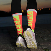 blaze through the night with the reflective hoop stripe at the top. during the day the bold neon colors and shiny quote will keep you going with a smile!
