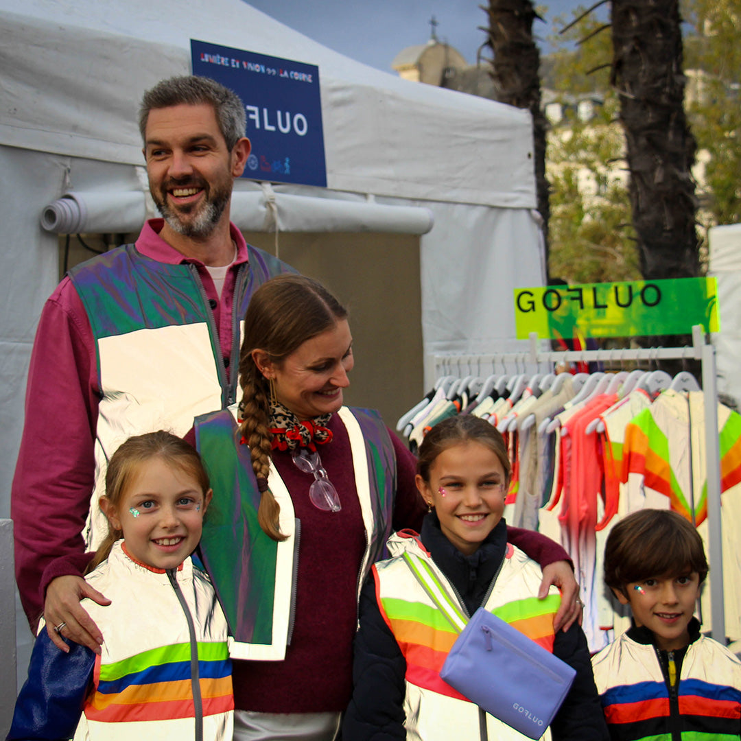 Her wardrobe is one to dream of. Beautiful classy fabrics and surprising textures with a dash of glitter. Julie loves putting her, and her kids’ outfits together. From pretty high knee socks to colorful headbands – they are always dressed down to the last detail. When dropping off her kids to school, she couldn’t bear watching all those ugly safety vests. However, she did want her kids to be safe and visible in traffic.